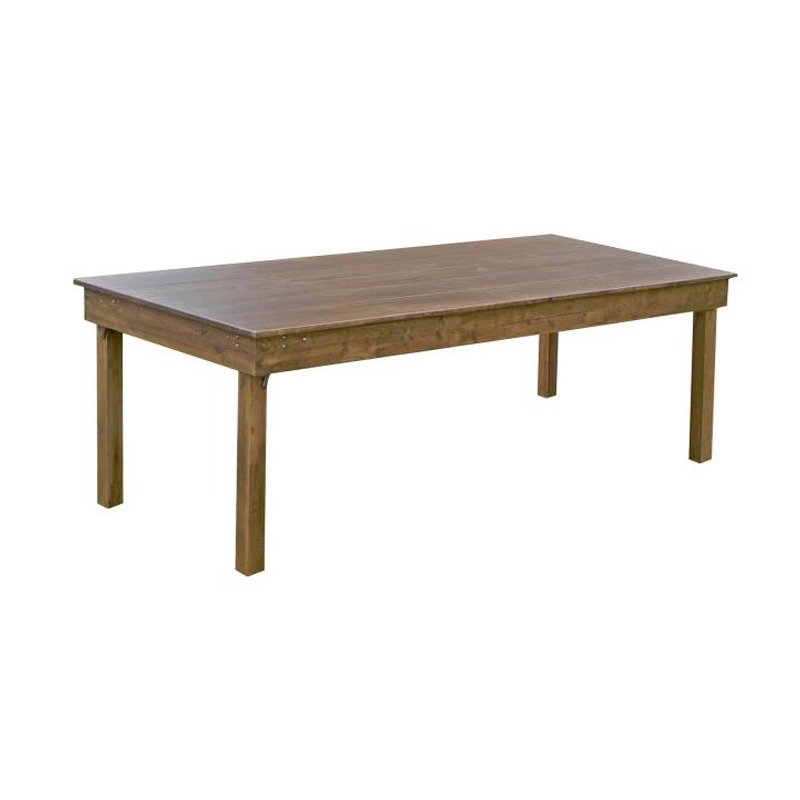 Each  8-foot farm table rental is made from real wood, giving it authentic texture and strength. Its rustic character pairs perfectly with Crossback or Chiavari chairs and enhances everything from floral garlands to elegant table runners.
